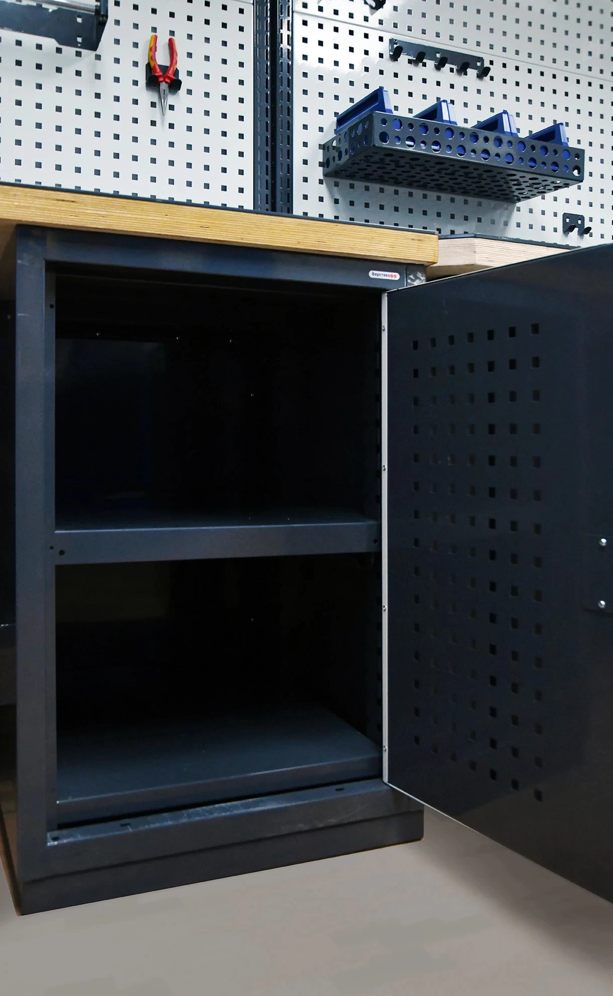 Рабочее место комплектуется двойным перфорированным экраном, на котором удобно размещать держатели для инструментов, полки и другие навесные элементы, благодаря чему весь необходимый инвентарь всегда будет на виду. Шаг перфорации — 38 мм. Максимальная нагрузка на панель — 150 кг.